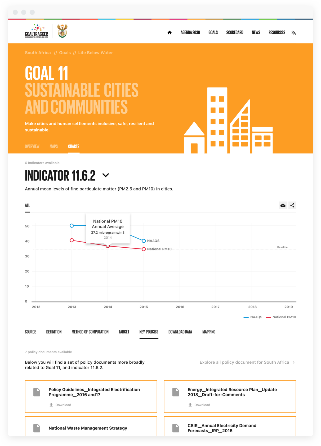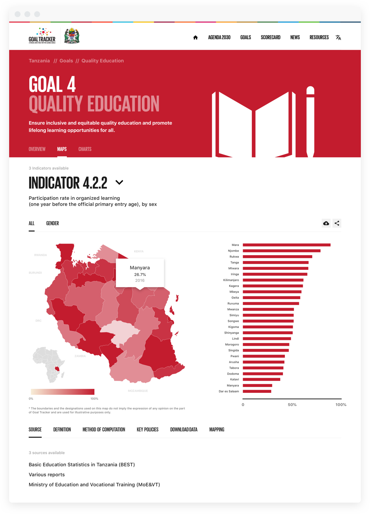 Goal Tracker is built on a foundation of core features and data visualization tools that can be adapted to any country. Together with local partners available data and relevant policies are analysed and then the platform is customized for each country. It draws on national statistics but can also pull data from many of other sources.